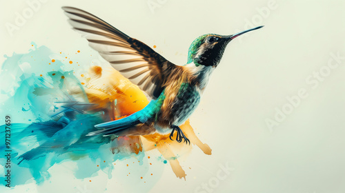 © GrayFrog, Fototapeta premium Flying hummingbird on watercolor background
