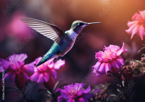 Fototapeta premium Flying hummingbird with green forest in background. Small colorful bird in flight.