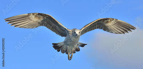 © Uryadnikov Sergey, Obraz premium Flying Juvenile Kelp gull (Larus dominicanus), also known as the Dominican gull and Black Backed Kelp Gull. False Bay, South Africa