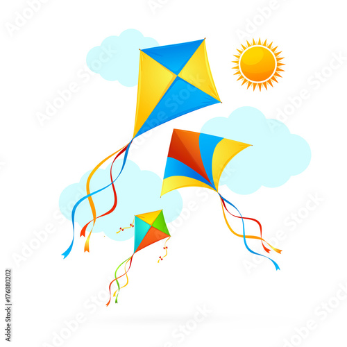 Fototapeta premium Flying Kite and Clouds on a Sky Summer Concept Background. Vector
