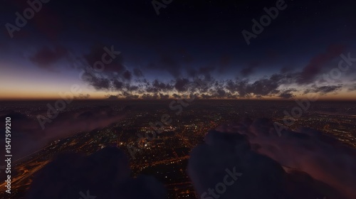 © Bilal, Fototapeta premium Flying over the deep night timelapse clouds with moonlight, seamlessly looped animation, flight through moving cloudscape over city lights