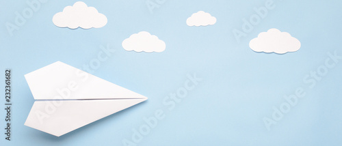 © mellisandra, Naklejka premium Flying paper plane in the clouds on a blue background. Concept of flight, travel, transfer. Top view, copy space, flat lay, banner