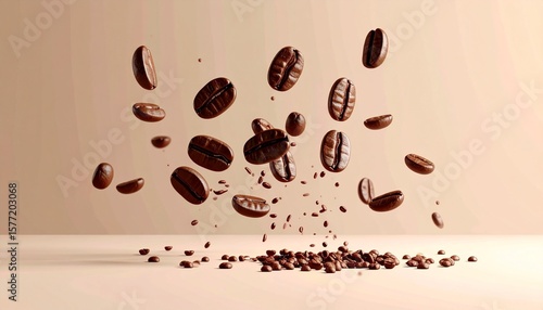 © ratihms04, Obraz premium Flying Roasted Coffee Beans on Beige Background