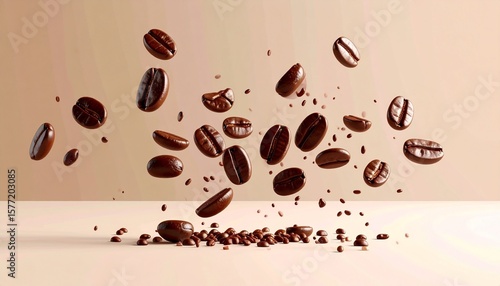 © ratihms04, Obraz premium Flying Roasted Coffee Beans on Beige Background