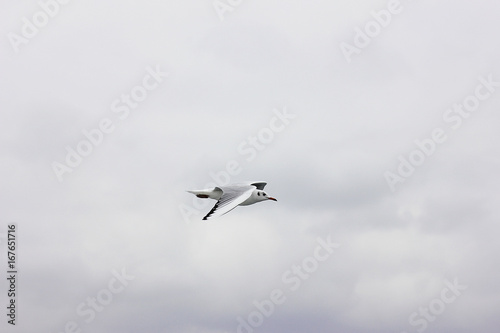 Fototapeta premium Flying seagull in a grey cloud sky