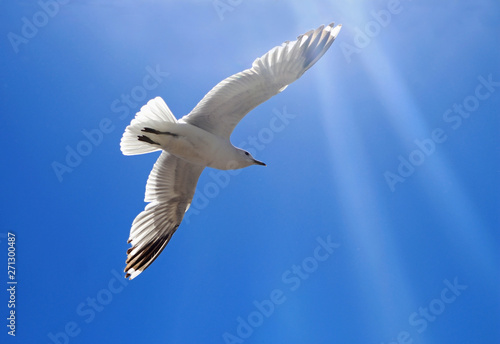 Obraz premium flying seagull in front of clear sky and sunbeams