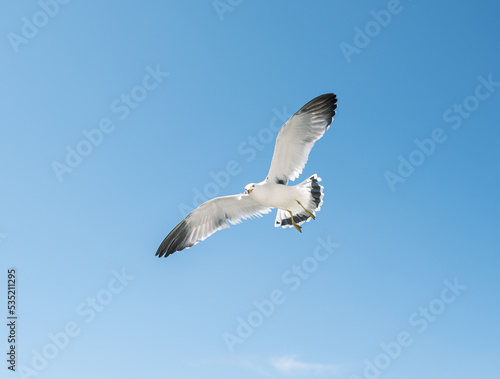 © Vladimir Arndt, Obraz premium Flying seagull over blue sky.