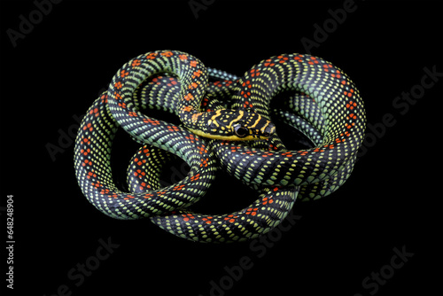 © Agus Gatam, Obraz premium Flying snake or gliding snake isolated on black background, Chrysopelea