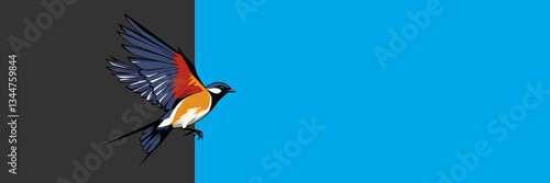 © Denys, Obraz premium Flying Swallow Illustration - Dark Charcoal / Bright Cyan Background