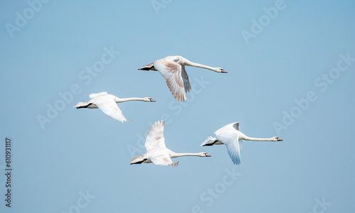 Fototapeta premium Flying swans in the blue sky. Waterfowl at the nesting site. A flock of swans...