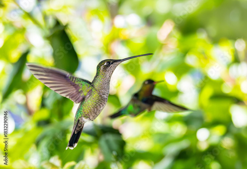 Fototapeta premium Flying Talamanca hummingbird (Eugenes spectabilis) or admirable hummingbird...