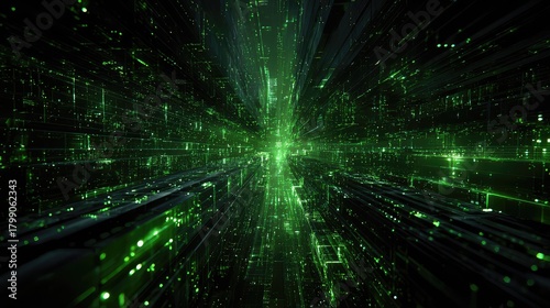 © PikePicture, Obraz premium Flying through green digital data stream network