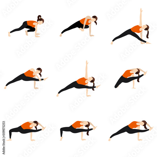 Obraz premium Flying warrior sequence yoga asanas set/ Illustration stylized woman practicing visvamitrasana variations