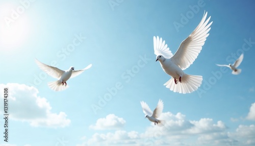 © Volha, Obraz premium Flying white doves in a blue sky with clouds