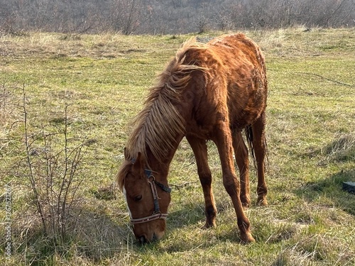 © Andrey, Fototapeta premium foal grazes in the meadow