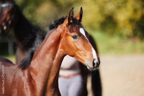 Obraz premium Foal horse brown in the sunshine on the riding arena.