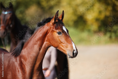 Fototapeta premium Foal horse brown in the sunshine on the riding arena.