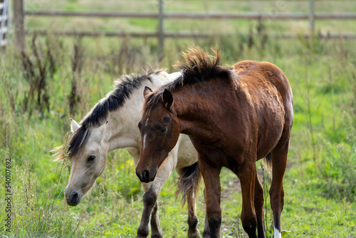 Fototapeta premium foal horse in the field playing with another horse