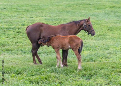 © kellyvandellen, Fototapeta premium Foal Nurses in Green Pasture