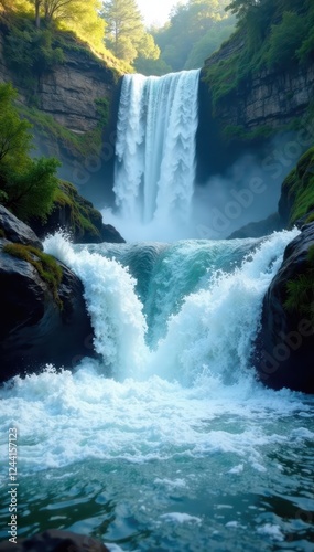 Obraz premium Foaming river receives powerful waterfall plunge, rocks, summer