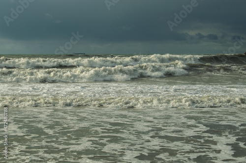 Fototapeta premium foamy sea walls roll onto a deserted shore from a stormy sea