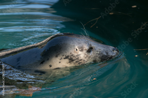 © Azahara, Obraz premium Foca gris en cauteverio relajada en el agua en el zoo de Madrid