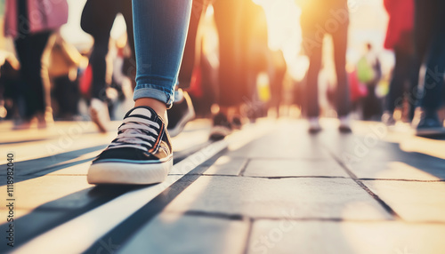 © Siranutt, Fototapeta premium Focus on a traveler’s feet standing on a marked waiting line. Generative AI.