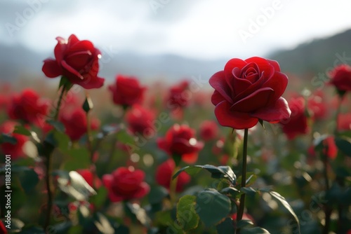 © Anjali, Naklejka premium Focus on red roses in a rose field