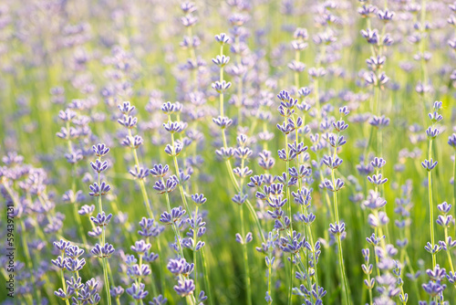 Fototapeta premium Focus on tender voilet lavender flowers, close up. Beautiful and odorous plant, oil industry