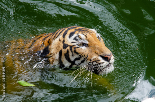© Nisathon Studio, Naklejka premium Focus on the Male tiger swimming in green