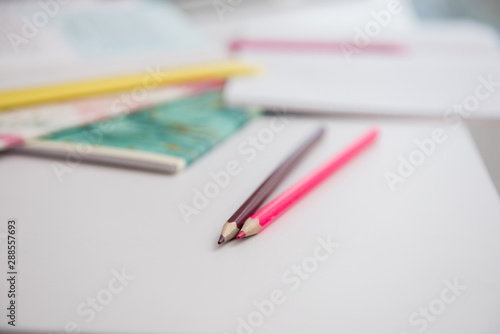 Fototapeta premium Focus on two pink colorful pencils at white desk