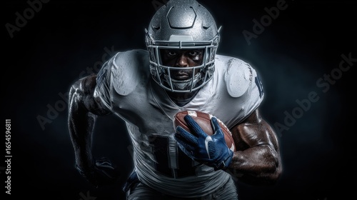 © master1305, Naklejka premium Focused American football player runs with a ball on a dark background, concept of athletic determination.