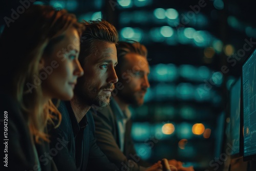 © whitestorm, Fototapeta premium Focused business professionals intently analyzing data on computer screens at night