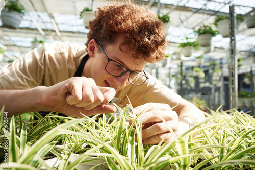 Obraz premium Focused by cutting plants. Young man with curly hair and in glasses is in...