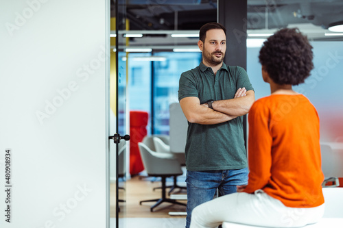 Obraz premium Focused caucasian man, listening to his african-american partner.