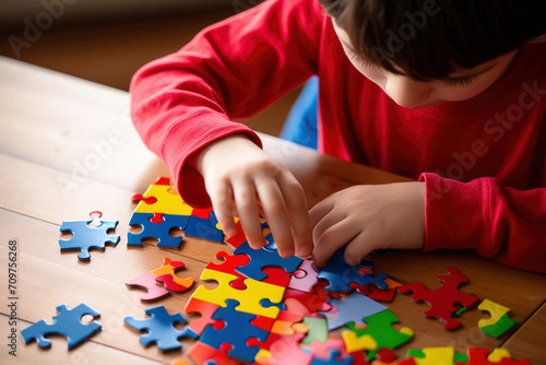 © talkative.studio, Fototapeta premium Focused child assembling colorful jigsaw puzzle pieces