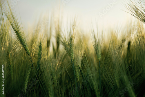 Obraz premium Focused close up view of growing green wheat on agricultural field