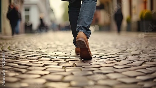 Fototapeta premium Focused closeup of person feet walking along city street capturing urban life...
