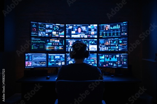 Fototapeta premium Focused Data Analyst in Dark Room Surrounded by Multiple Monitors Displaying Complex Data Visualizations and Analytics