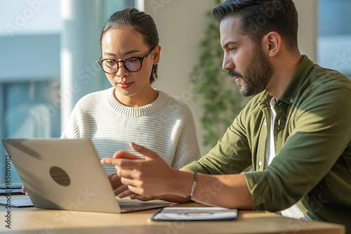 © Liton Khan, Fototapeta premium Focused diverse colleagues collaborating on project using laptop in bright modern office with natural light