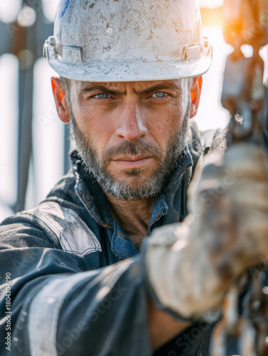 © Daria, Obraz premium Focused experienced male construction worker in protective gear handling heavy chains while working outdoors at an industrial site with determination and precision