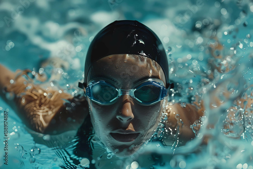 © Natallia, Fototapeta premium Focused female swimmer gliding through water