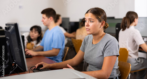 Obraz premium Focused female teenager solving tasks of computer science in the auditory