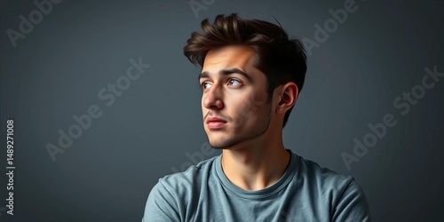 © Boonyapawn, Naklejka premium Focused individual with slumped shoulders, contemplating a new idea; grey background, thoughtful, focus