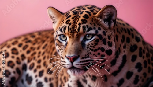© Rifki Fachrudin, Fototapeta premium Focused Leopard Portrait with Intense Gaze and Pink Background Detail