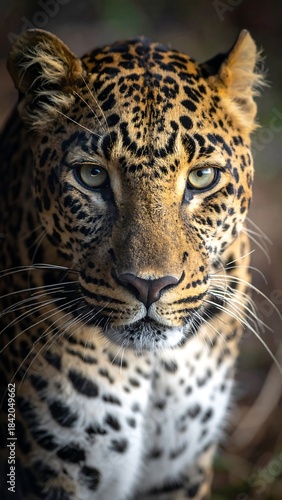 © Friska, Fototapeta premium Focused leopard portrait with yellow eyes and spotted fur against a blurred background