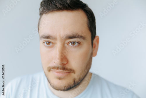 © Alexandr, Obraz premium Focused man with brown eyes and light shirt in neutral background
