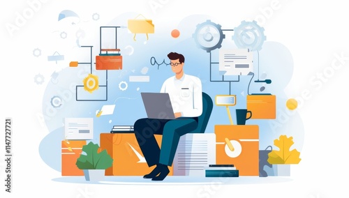 © eQuinox Studio, Fototapeta premium Focused Man Working on Laptop Amidst Complex Workflow