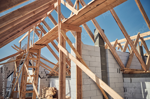 © Svitlana, Obraz premium Focused photo on wooden partition on the building