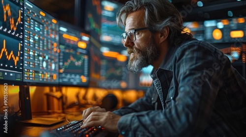 Obraz premium Focused Professional Analyzing Data Trends on Multiple Monitors During...